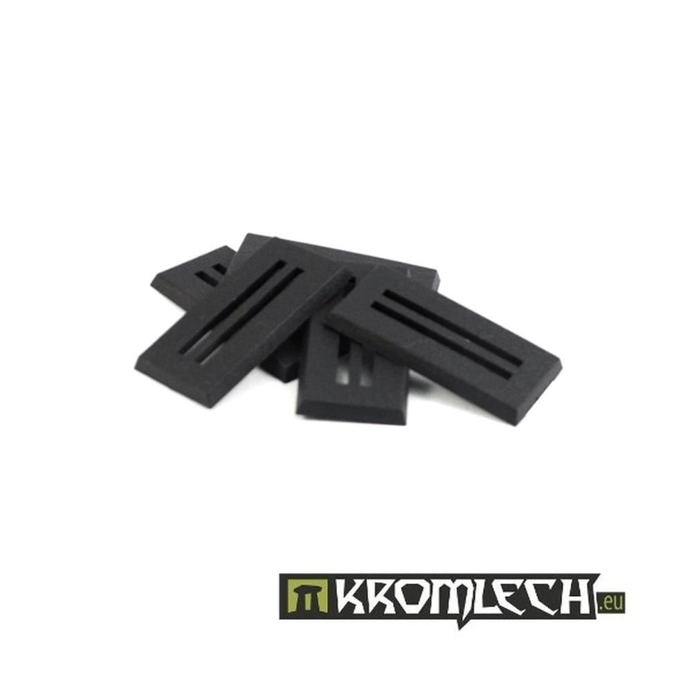 This set contains 5 50mm x 25mm plastic cavalry bases with slots.