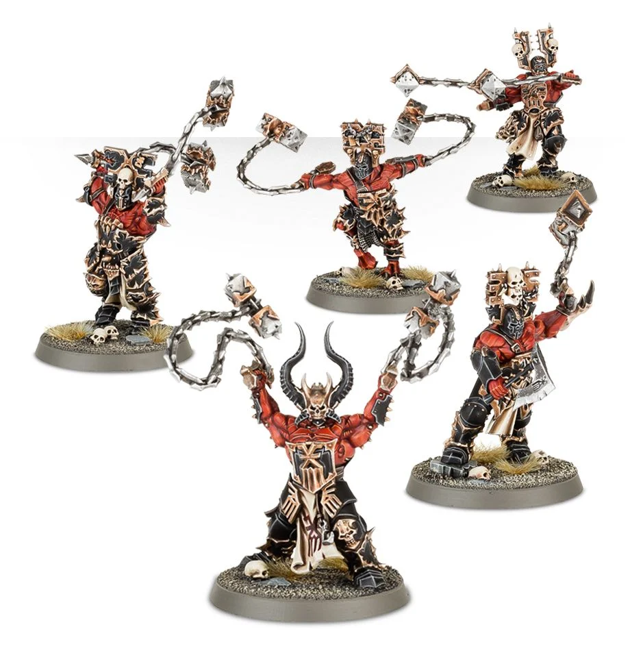 The Wrathmongers are each armed with a pair of wrath-flails. There are five helmeted heads and the option to distinguish the champion with the addition of a helmet designed to look like a Bloodletter’s face and a mutation in the shape of a scorpions tail.