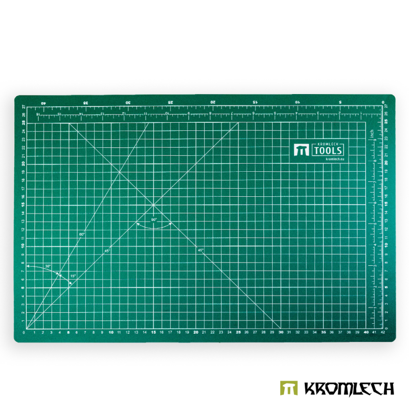 The Kromlech Cutting Mat provides a durable surface for all your modeling work, model assembly, or figure conversions and helps protect your desk or table from possible damage. They are essential for any wargaming enthusiast. Self-healing - top and bottom layers are composed of a regenerative material where cuts close up on their own. Environment friendly - mat is EN71-3 approved. It contains no heavy metals and is safe for the environment. Multi-purpose - the double-sided cutting mat can double as a cutting surface and as a table/desk mat. Easy measuring – each mat has a measuring grid in both centimeters and inches printed on one side. Additionally, it features lines crossing at various angles (15º, 30º, 45º, 60º, 90º) for even more help during modeling work.