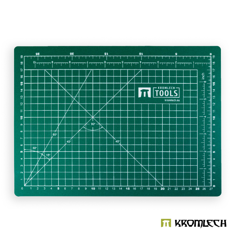 The Kromlech Cutting Mat provides a durable surface for all your modeling work, model assembly, or figure conversions and helps protect your desk or table from possible damage. They are essential for any wargaming enthusiast. Self-healing - top and bottom layers are composed of a regenerative material where cuts close up on their own. Environment friendly - mat is EN71-3 approved. It contains no heavy metals and is safe for the environment. Multi-purpose - the double-sided cutting mat can double as a cutting surface and as a table/desk mat. Easy measuring – each mat has a measuring grid in both centimeters and inches printed on one side. Additionally, it features lines crossing at various angles (15º, 30º, 45º, 60º, 90º) for even more help during modeling work.