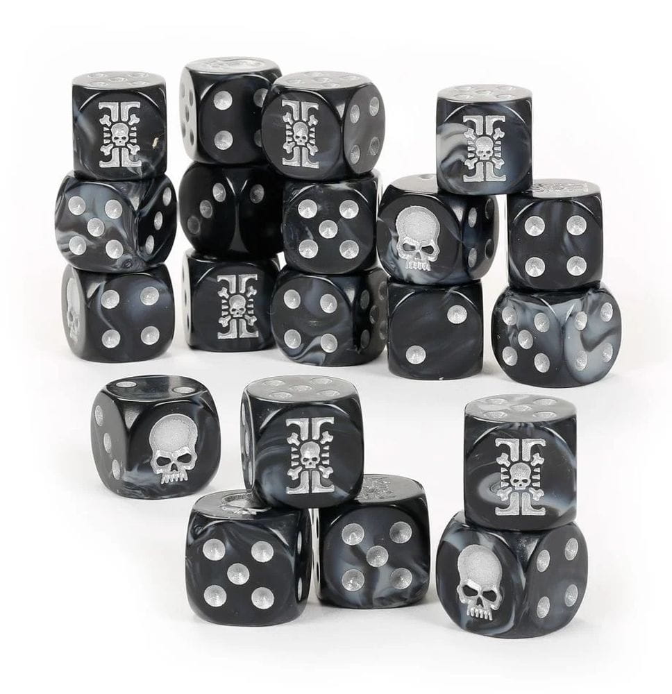 Each six-sided, round-cornered die is black with silver swirls. The 20 dice in this set each measure 16mm x 16mm and feature the Deathwatch icon on the 6 face, a skull symbol on the 1 face, and tradition pips on the other faces, all picked out in silver. The dice are supplied in a plastic sleeve inside a flip-top box, with a view hole at its centre. The box itself is covered in Deathwatch artwork.
