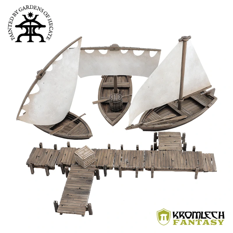 Zestaw zawiera trzy duże łodzie z żaglami, trzy średnie pomosty, trzy krótkie pomosty, jeden stopień, jedną skrzynię, jedną beczkę i cztery wiosła.