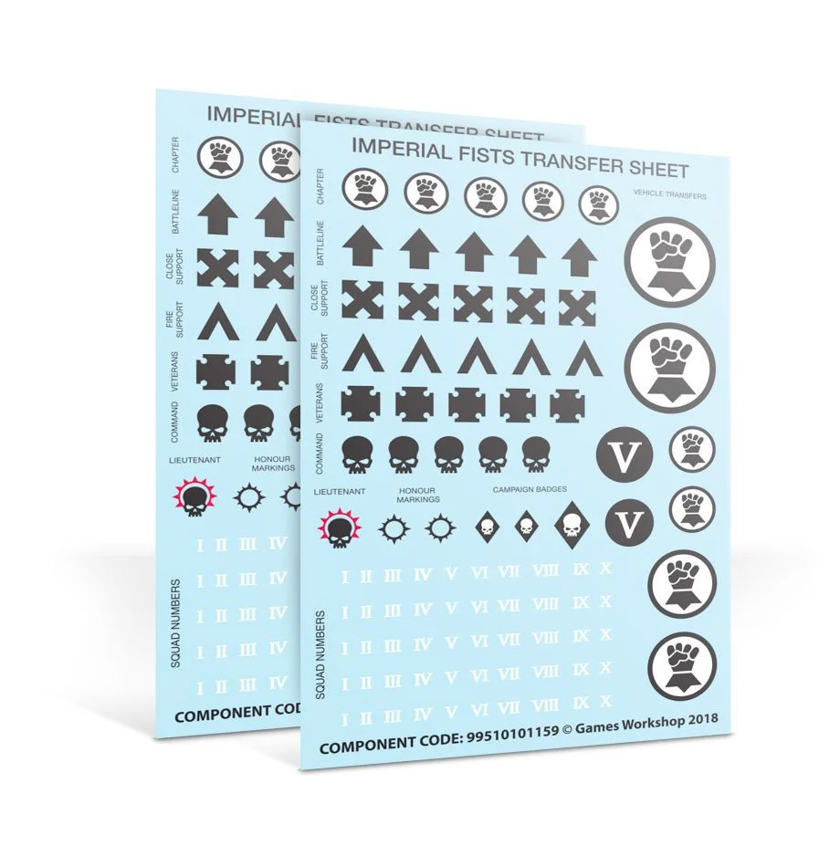 The set also contains 2 transfer sheets including Chapter, squad and vehicle transfers, as well as campaign badges, squad numbers, rank and honour markings.