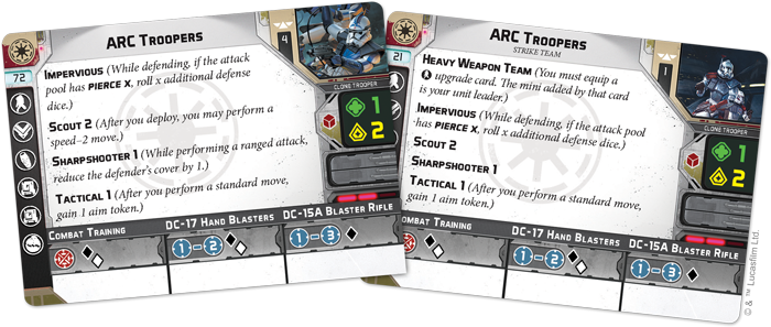Finally, several troopers are highly posable as they blast into action with their JT-12 jetpacks. In addition to their appearance, eight upgrade cards let you outfit your ARC Troopers in battle and two unit cards let you add them to your army as either a full unit or a two-man strike team.